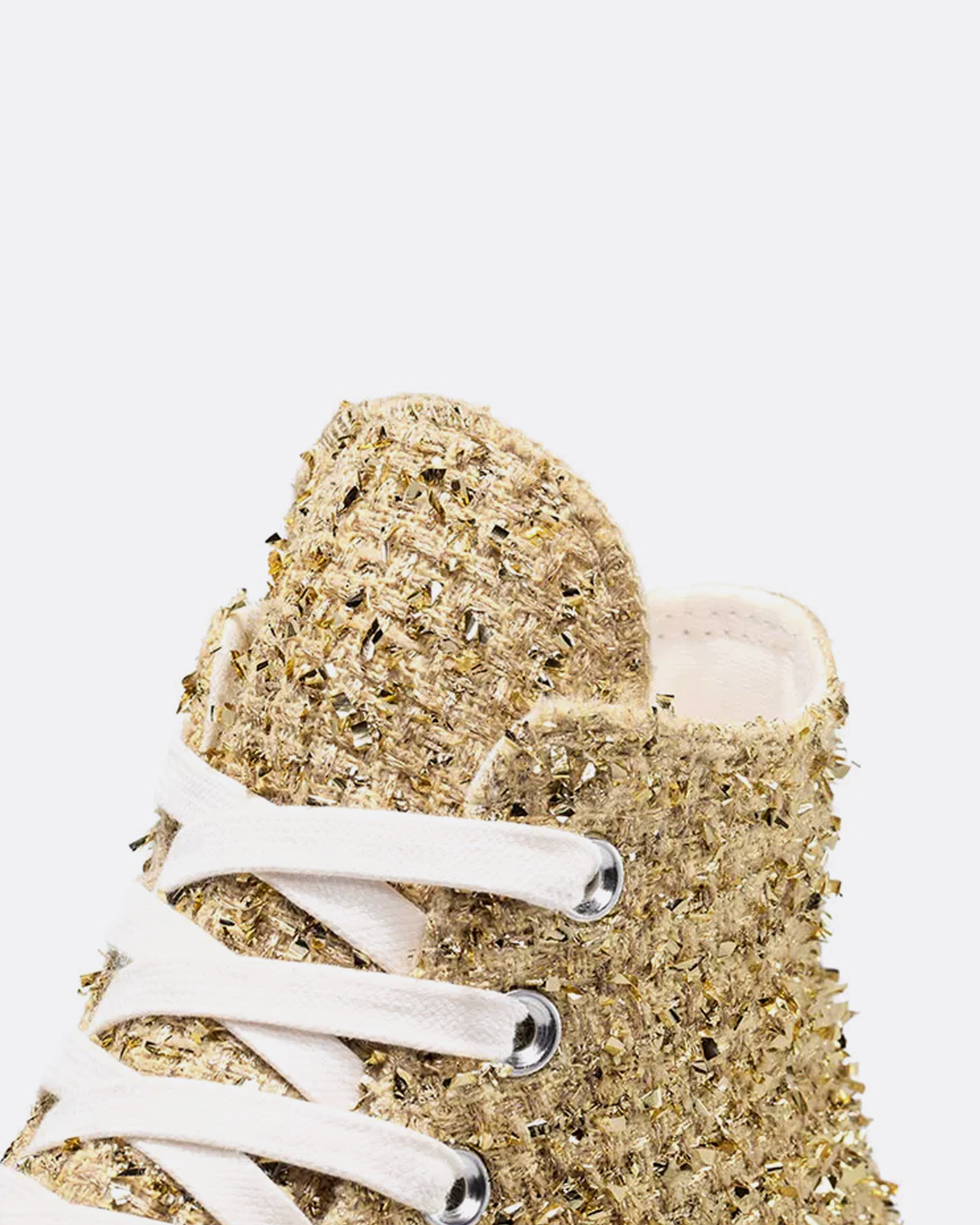 - Un empeine tejido metálico, similar al tweed, añade textura y brillo a cualquier atuendo.